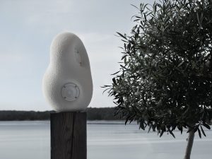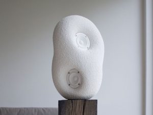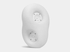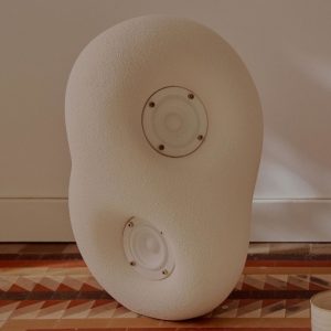 این طرح مفهومی با الهام از سنگهای صاف رودخانه و مجسمههای انتزاعی، با شکلی شبیه سنگریزه و روکش بافتدار که هم حس لامسه و هم حس کنجکاوی بصری را برمیانگیزد، ساخته شده است. این بلندگو که در رنگهای سفید مات یا مشکی موجود است، از Jesmonite، یک کامپوزیت اکریلیک معدنی پایه آب، ساخته شده است. این انتخاب جنس، هم وزن فیزیکی و هم کیفیت لمسی منحصر به فردی را به بلندگو میدهد که حس ارگانیکی دارد.