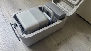 با شروع جعبه‌گشایی، از دیدن JMGO N1S 4K که در یک کیف حمل فوم سخت بسته‌بندی شده بود، شگفت‌زده خواهید شد. اگرچه بادوام‌ترین نیست، اما باید برای محافظت از پروژکتور و لوازم جانبی آن در حین حمل و نقل بیش از حد کافی باشد. با باز کردن قاب، خود پروژکتور به همراه یک ریموت و یک آداپتور برق تقریباً به اندازه یک شارژر لپ‌تاپ میان‌رده نمایان می‌شود.