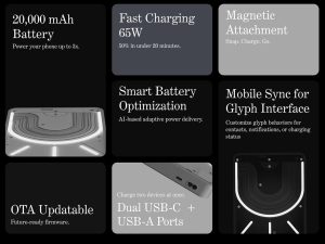 این پاوربانک با الهام از مسیرهای مدار و منطق فیزیکی گوشی Nothing (1) و با تمرکز بر زبان بصری ساخته شده است. هر چراغ در پشت دستگاه باید معنایی داشته باشد و بنابراین ویژگیهایی مانند سطح باتری را نشان میدهد. رابط کاربری glyph فراتر از نشانگر باتری داخلی عمل میکند و با اتصال به تلفن هوشمند شما، اعلانها و وضعیت شارژ را نیز نشان میدهد. رابط کاربری Glyph این پاوربانک با تبدیل نور به اطلاعات، دقیق و هدفمند است. این گجت دارای یک باتری 20000 میلیآمپر ساعتی است که میتواند حداقل سه بار گوشی شما را شارژ کند و از شارژ سریع 65 واتی بهره میبرد که در کمتر از 20 دقیقه تا 50 درصد شارژ میشود.