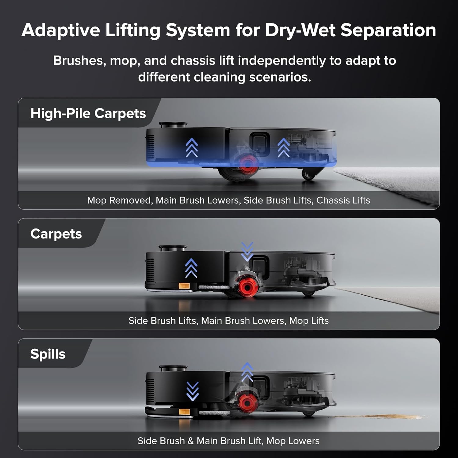 شاسی AdaptiLift امکان تنظیم مستقل چرخ‌ها را فراهم می‌کند، به‌طوری‌که Saros 10R می‌تواند تا 4 سانتی‌متر از موانع مانند آستانه درها عبور کند. این جارو قادر است شاسی خود را تا 10 میلی‌متر برای فرش‌های پرز بلند بالا ببرد و از مسدود شدن ورودی مکش جلوگیری کند. همچنین، در حالت تمیزکاری مایعات، شاسی، برس اصلی و برس کناری به‌صورت خودکار بالا می‌روند تا از خیس شدن فرش‌ها جلوگیری شود. این ویژگی Roborock Saros 10 را به گزینه‌ای ایده‌آل برای خانه‌هایی با انواع مختلف کف‌پوش تبدیل می‌کند.
