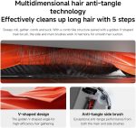 این دستگاه از فناوری پیشرفته ضدگره مو بهره میبرد که در پنج مرحله موها را بهطور مؤثر از سطح زمین جمعآوری میکند: جارو، غلتاندن، جمعکردن، شانهکردن و مکش. برس اصلی با طراحی V شکل طلایی و ساختاری شبیه به شانه، به همراه برس جانبی، بهصورت هماهنگ عمل میکنند تا از گیر کردن مو جلوگیری شده و تمیزکاری روان و بیوقفه انجام شود.