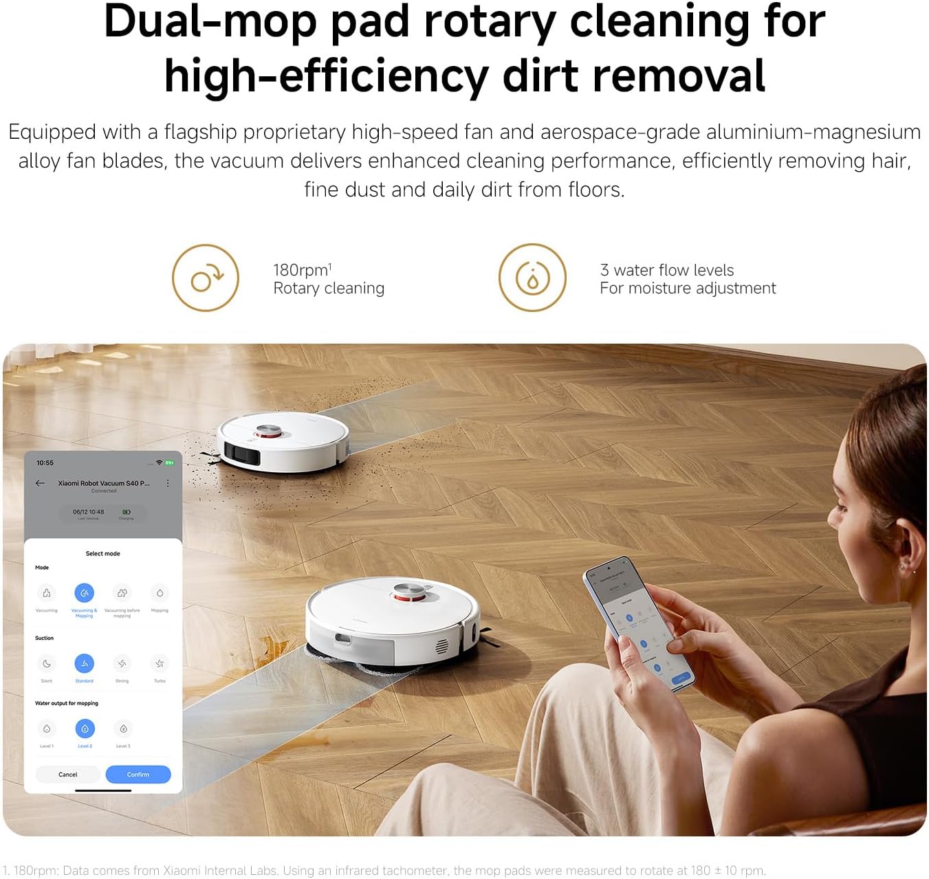 فن دمنده با مکش قدرتمند ۱۵۰۰۰ پاسکال، گرد و غبار سرسخت را به طور موثر از بین می‌برد. این گجت هوشمند که به یک فن اختصاصی پرسرعت و پره‌های فن از جنس آلیاژ آلومینیوم – منیزیم با کیفیت هوافضا مجهز شده است، عملکرد تمیزکنندگی پیشرفته‌ای را ارائه می‌دهد و به طور موثر مو، گرد و غبار ریز و آلودگی‌های روزانه را از روی کف پاک می‌کند.